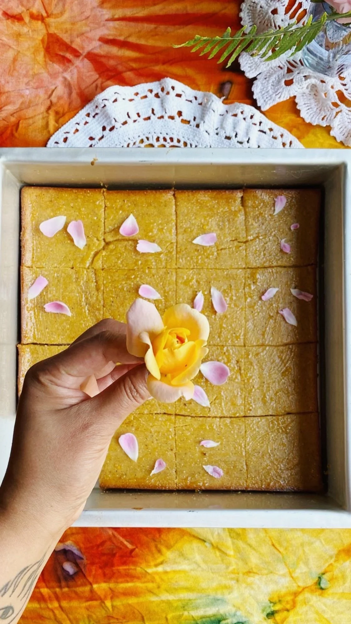 Passion Orange Butter Mochi topped with candied oranges and homegrown fuchsia